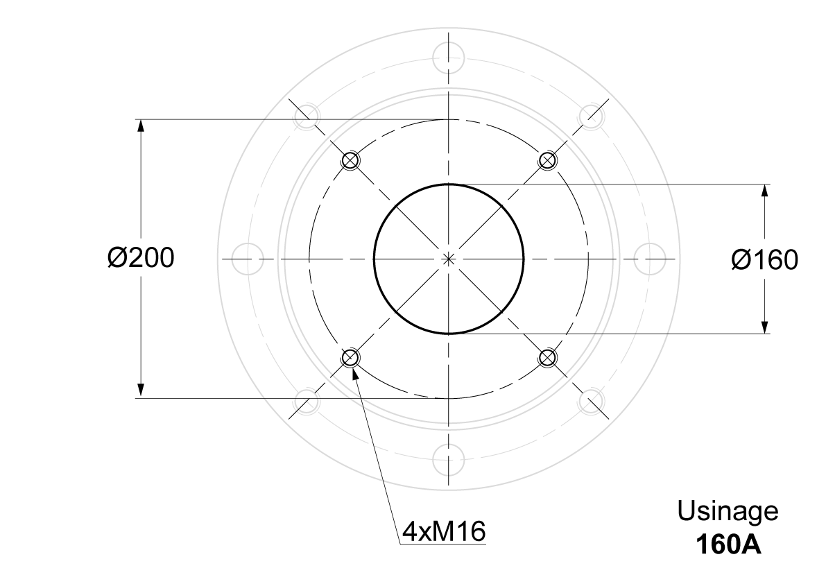 | Usinage sur la lanterne | Centrage Ø160 + 4xM16 sur Ø200 |